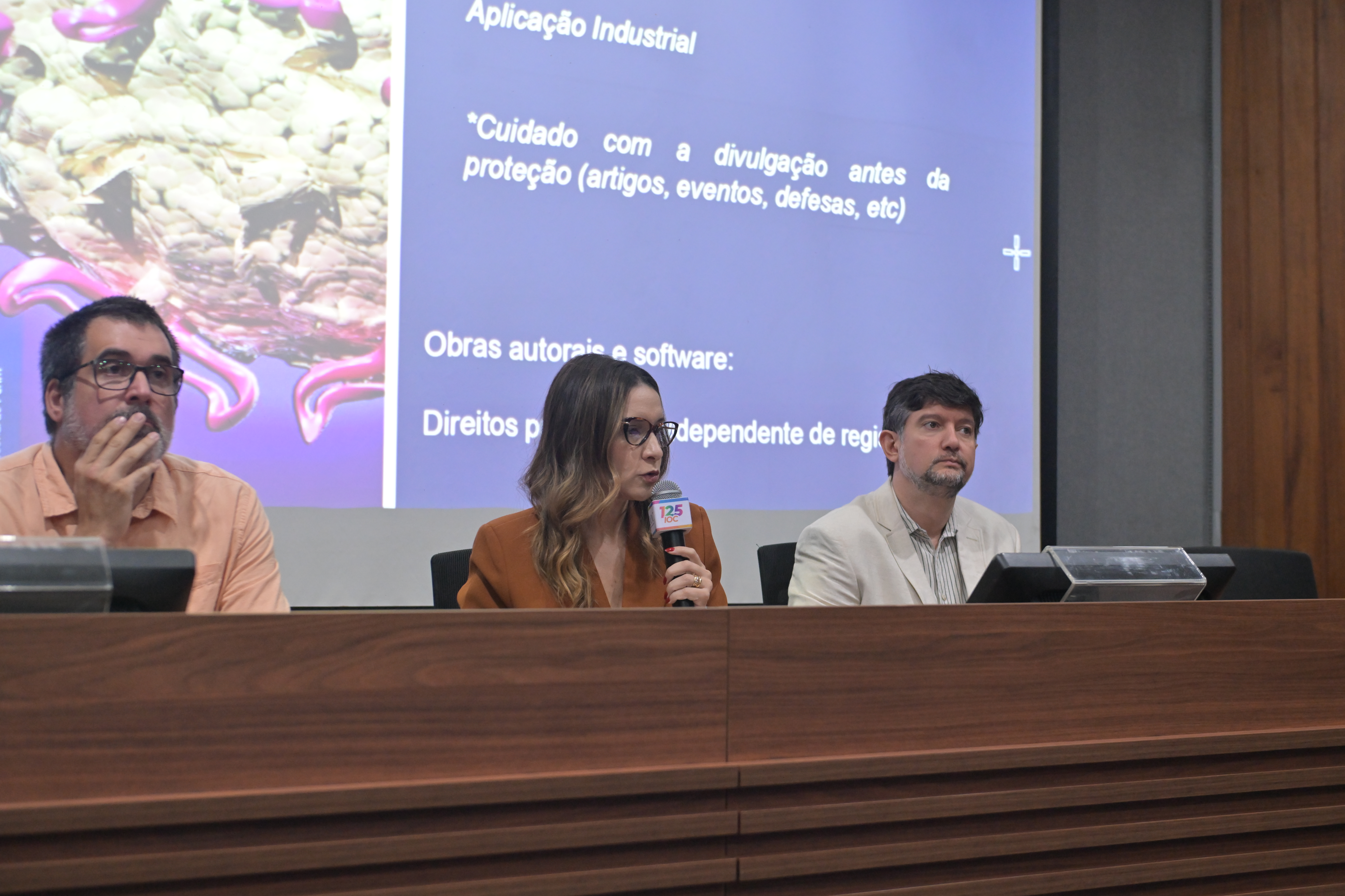 Apresentando o passo a passo do processo de proteção de inovações desenvolvidas no IOC, ela reforçou a necessidade de atenção em divulgações de projetos para garantir registros de patente.