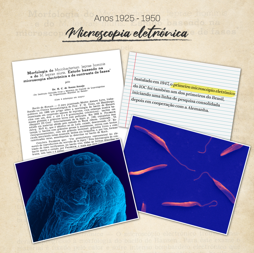 Instalado em 1947, o primeiro microscópio eletrônico do IOC foi também um dos primeiros do Brasil. Com poder de resolução muito superior aos microscópios óticos, o aparelho permitia observar detalhes de estruturas no interior das células e contribuiu, por exemplo, com estudos sobre o bacilo da hanseníase. Embora este equipamento tenha permanecido pouco tempo em funcionamento, um acordo de cooperação, nos anos 1970, consolidou a atuação do IOC na microscopia eletrônica.