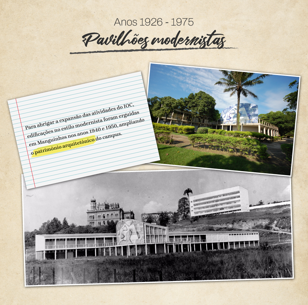 Nos anos 1940 e 1950, construções modernistas foram erguidas no campus de Manguinhos para abrigar a expansão das atividades do IOC. Projetado pelo arquiteto Jorge Ferreira, o Pavilhão Arthur Neiva, também conhecido como Pavilhão de Cursos, conta com mural de azulejos e paisagismo concebidos por Burle Marx. Até hoje, abriga auditório, atividades de ensino e laboratórios.