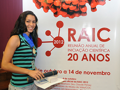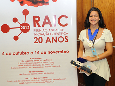 Orientada pela chefe do Laboratório de Pesquisa em Leishmanioses do IOC, Elisa Cupolillo, TaÃse Salgado de Oliveira foi agraciada com o 3º lugar na modalidade Ciências da Vida. A aluna, que apresentou o trabalho intitulado Análise de sÃtios ambÃguos nas sequências de um fragmento do gene 6PGDH: multiclonalidade ou heterozigoze?, está desde 2009 no Instituto. A RAIC me deu a oportunidade de conhecer todos os estudos, em diversas áreas do conhecimento. Ganhar o prêmio não foi fácil, pois todos os trabalhos eram bons, disse.
