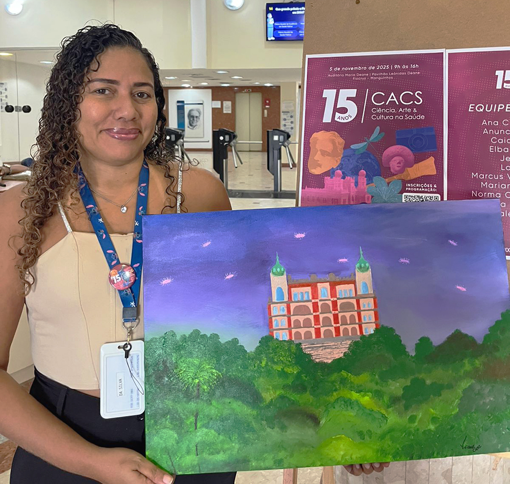 Entre as obras expostas, estava a pintura da bolsista Viviane Cruz, do Laboratório de Enterobactérias do IOC, que retratou o Castelo Mourisco sob um céu estrelado por ‘Salmonellas’, em referência poética à área em que atua.